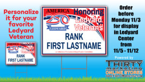 Show your support for Ledyard Veterans and have a sign made to display on Route 117 in Ledyard Center from Wednesday, November 5th, thru Wednesday, November 12th.