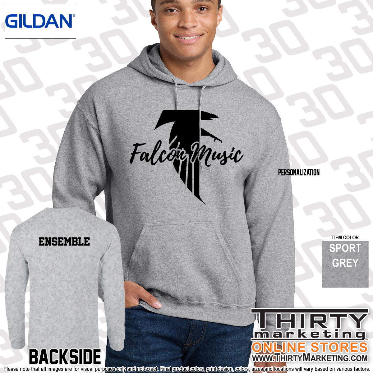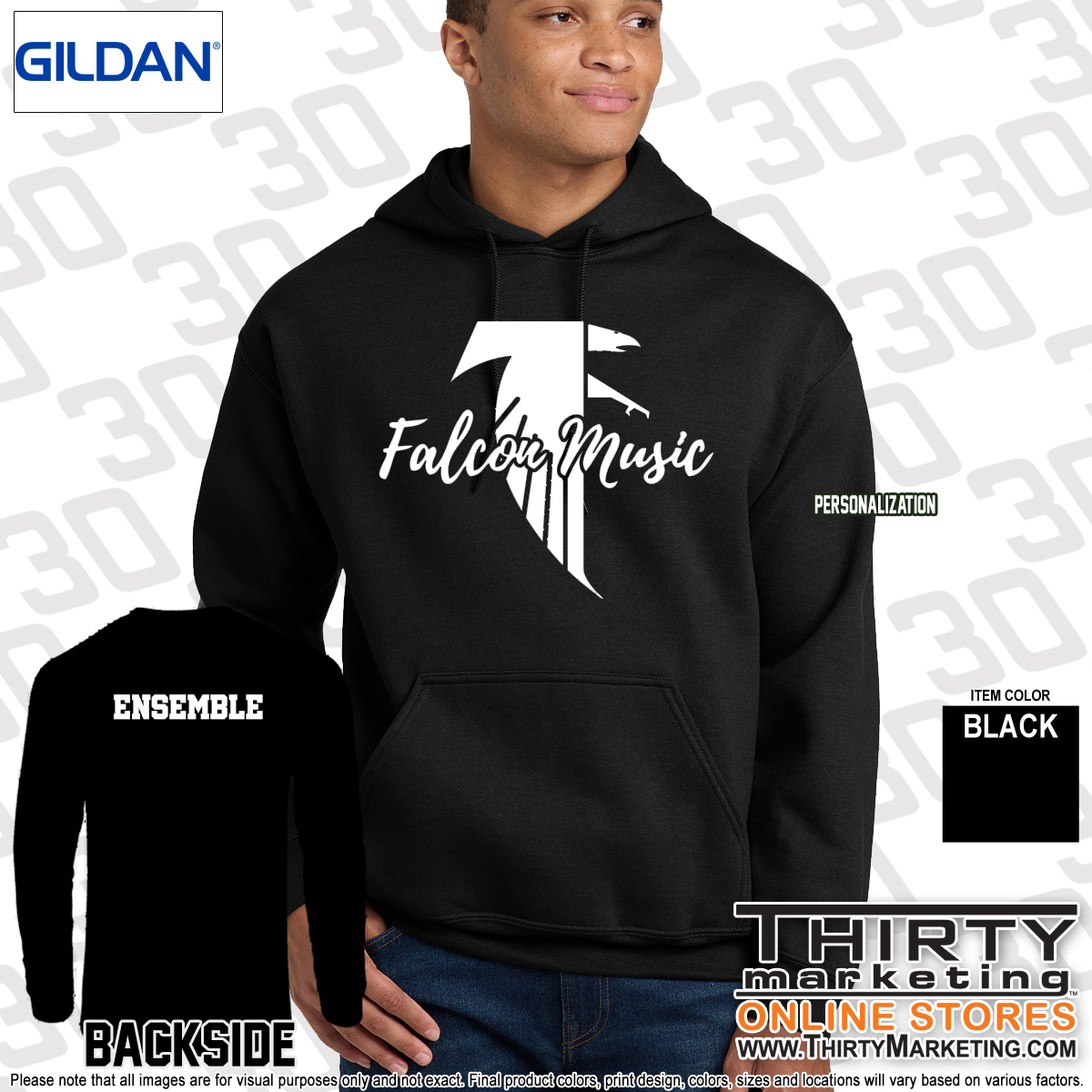 - Screen printed with Falcon Music design and optional ensemble on the back