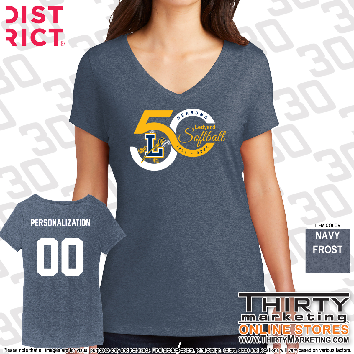 - LHS Softball 50 Seasons design screen printed on the front
