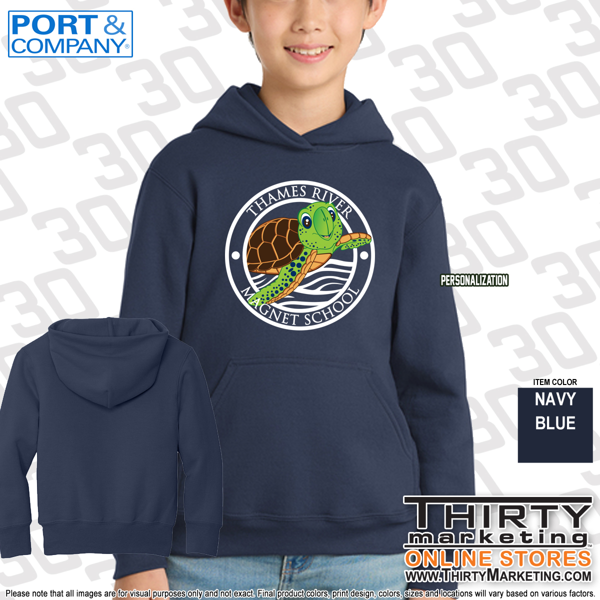 - Thames River Magnet School design screen printed on front